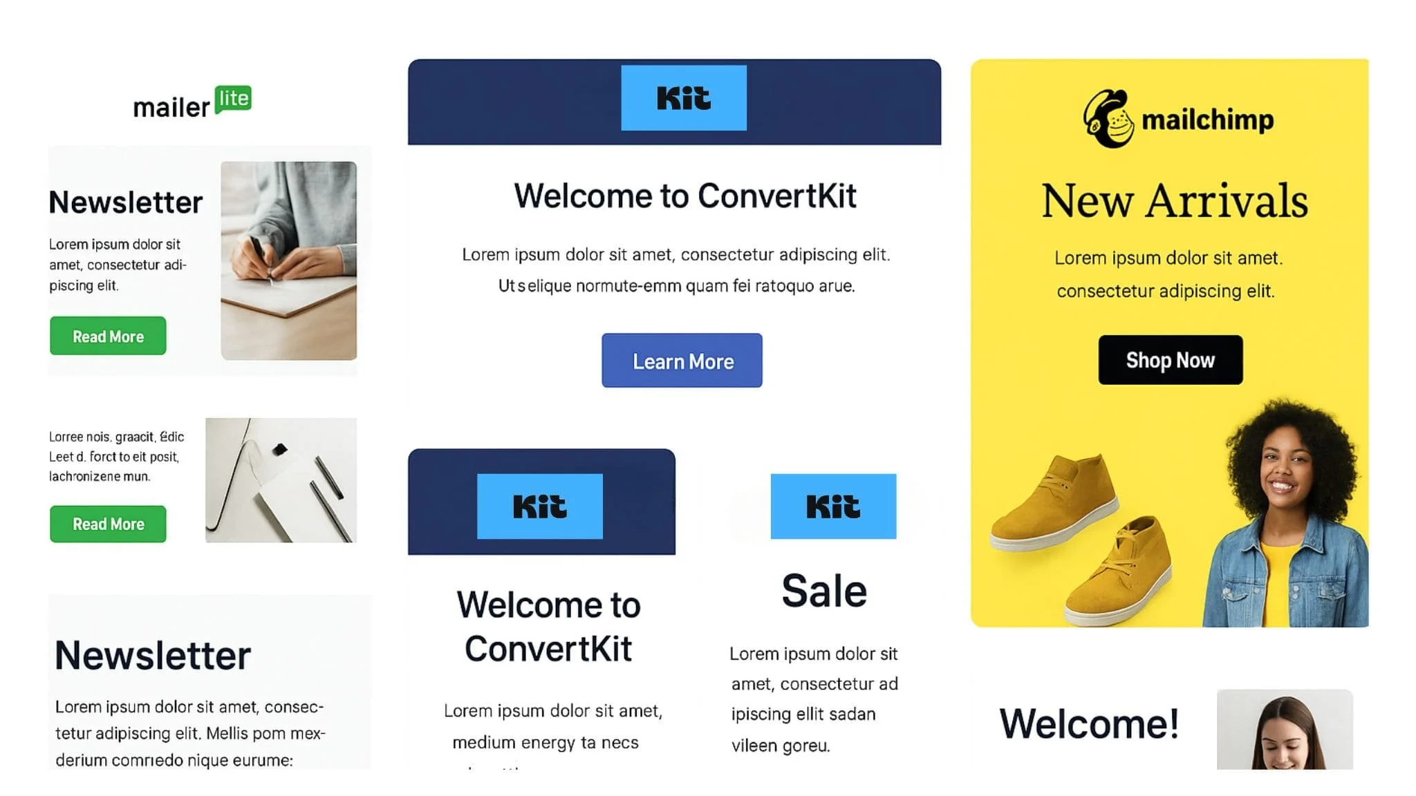 Collage of beautifully designed email templates from MailerLite, ConvertKit and Mailchimp showing newsletters and welcome emails.