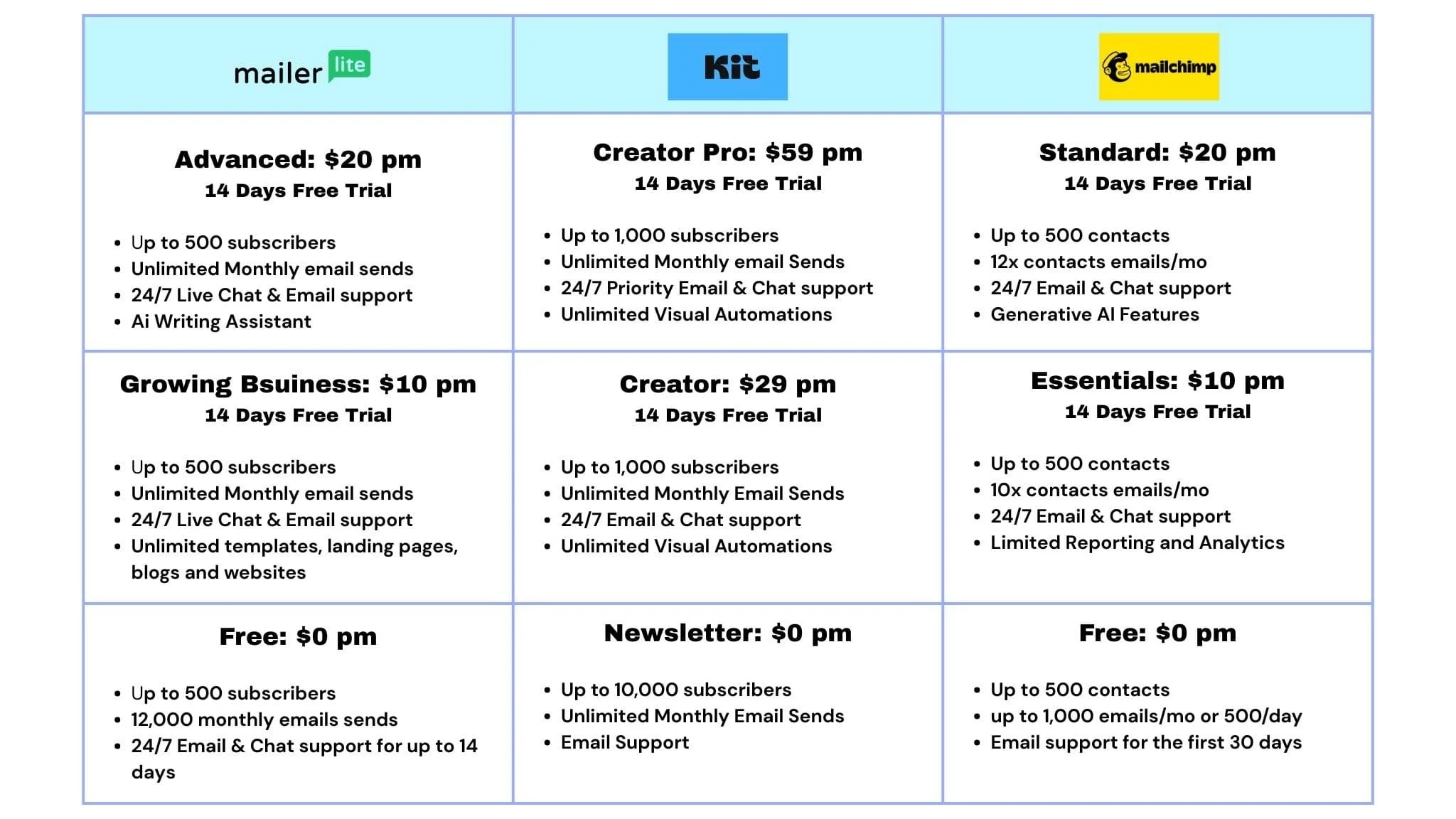 Price Comparison Chart for MailerLite vs ConvertKit vs Mailchimp