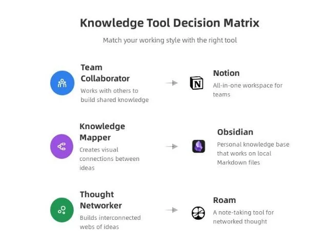 Decision matrix visualization with three pathways leading to different user types. Visual flowchart style showing 'Team Collaborator → Notion', 'Knowledge Mapper → Obsidian', 'Thought Networker → Roam'.