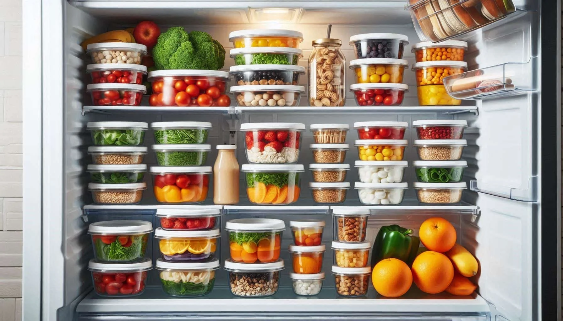 Well-organized refrigerator with systematic meal prep container arrangement for busy professional productivity