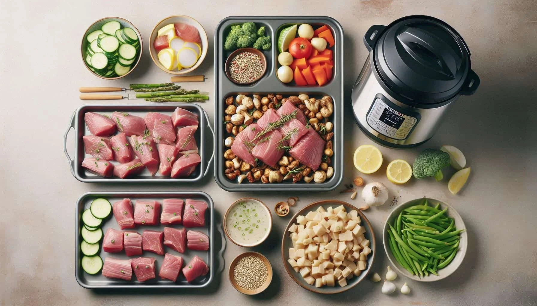 Raw protein ingredients organized on sheet pans for efficient meal prep batch cooking for remote workers
