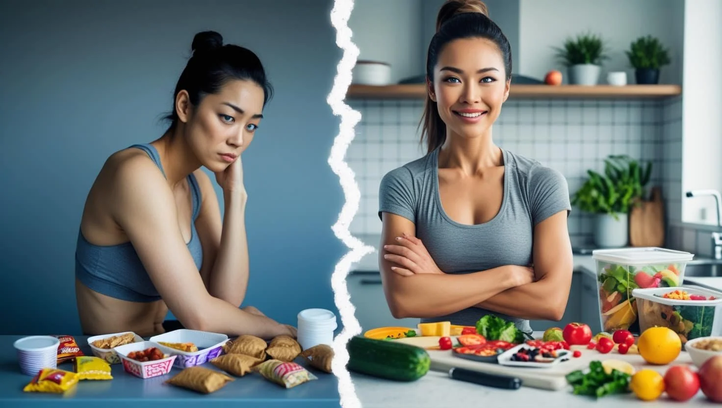 Unhealthy snack and sad remote worker woman vs Healthy snacks and radiant worker woman