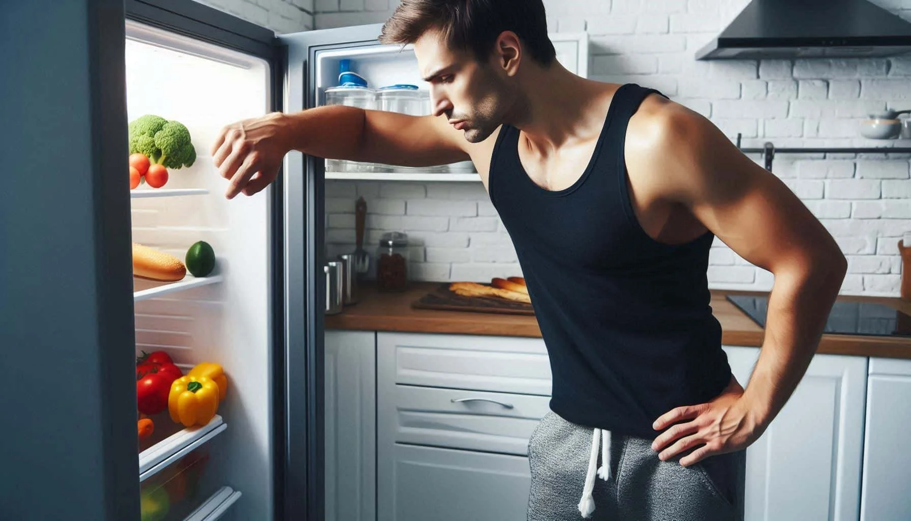 Remote worker searching empty refrigerator after video call highlighting need for productivity meal prep planning