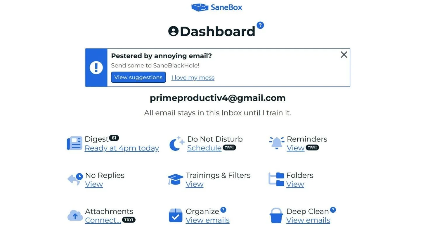 Look, I'm not going to pretend that SaneBox is going to solve all your productivity problems or transform you into some email-managing superhuman. But what it will do is give you back hours of your week and eliminate that low-level anxiety that comes with an overwhelming inbox.